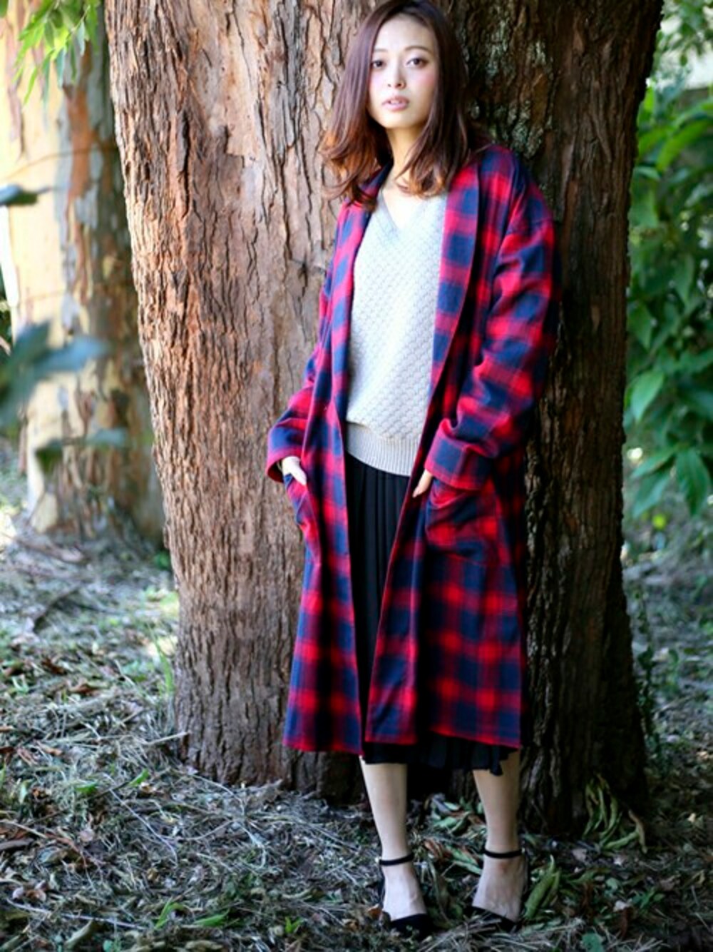 チェックガウン・レッド/FREE ポップコーンVネックニット・グレー/FREE(10/2トピックス掲載商品) ジョーゼットプリーツスカート・ブラック/FREE 【WEB限定】セパレートパンプス・ブラック/MEDIUM H162cm