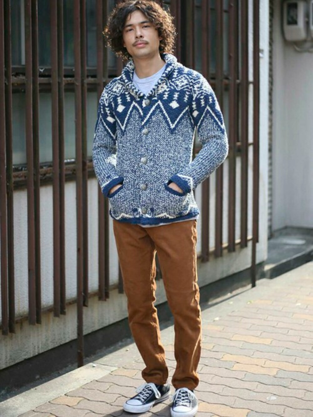 【16AW新作予約】オルテガ柄ショールカラーカーディガン・ブルー系その他/MEDIUM(10/1トピックス掲載商品) コーデュロイテーパードパンツ・ブラウン/MEDIUM H173 W73 58kg