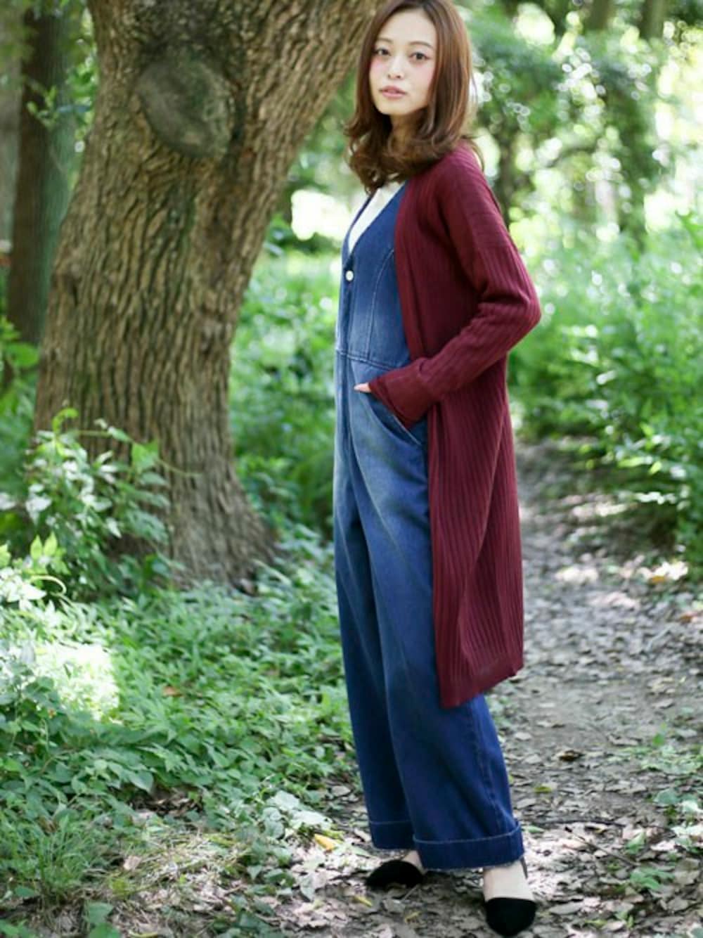 リブニットカーディガン・ワイン/FREE(10/7トピックス掲載商品) ベーシック無地ロンTEE・オフホワイト/FREE デニムサロペット・インディゴブルー/SMALL 【WEB限定】セパレートパンプス・ブラック/MEDIUM H162cm