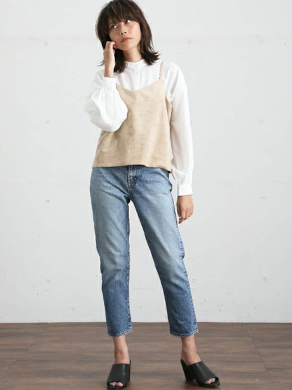フェイクスウェードキャミソール・ホワイト/FREE ボリュームスリーブバンドカラーシャツ・ベージュ/FREE 【Made In Japan】ボーイズデニムパンツ・インディゴブルー/X-SMALL H164 B75 W58 H85