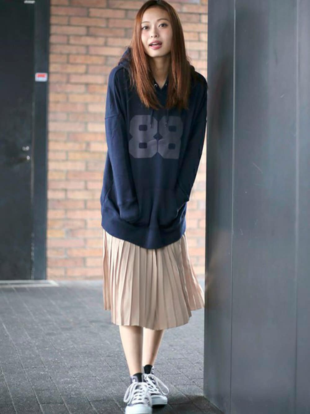 スウェットプルオーバーパーカー88・ベージュ/FREE ジョーゼットプリーツスカート・ネイビー/FREE H162cm