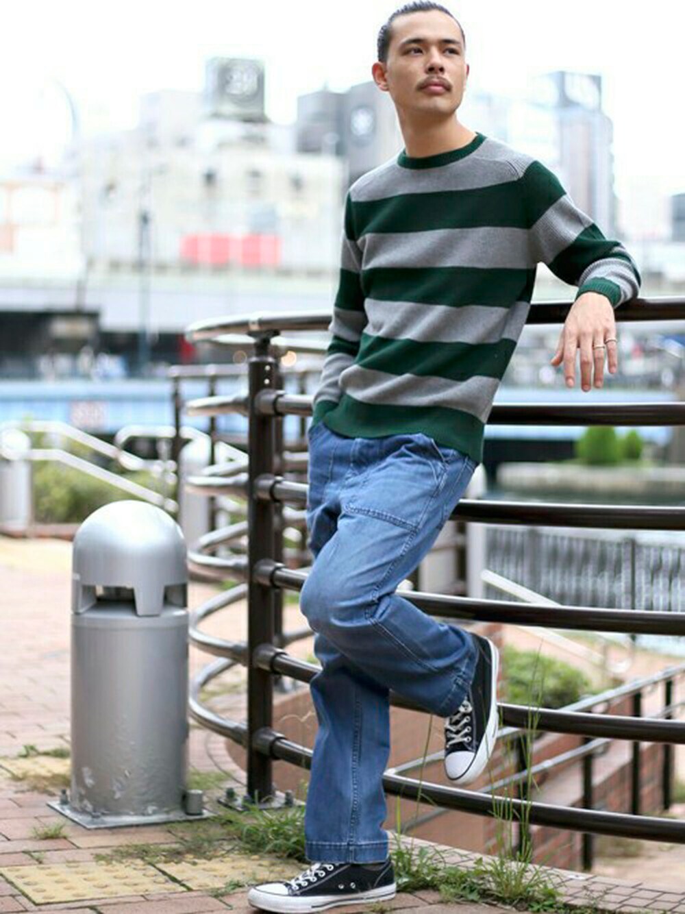 片畦ボーダーニット・グリーン系その他5/MEDIUM デニムワークパンツUSED/ユーズドウォッシュ・インディゴブルー/MEDIUM model:H173 W73 58kg