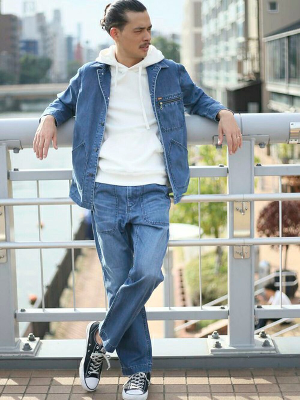 デニムカバーオールジャケットUSED/ユーズドウォッシュ・インディゴブルー/MEDIUM 甘編み裏毛プリントプルオーバーパーカー・ホワイト/MEDIUM デニムワークパンツUSED/ユーズドウォッシュ・インディゴブルー/MEDIUM model:H173 W73 58kg