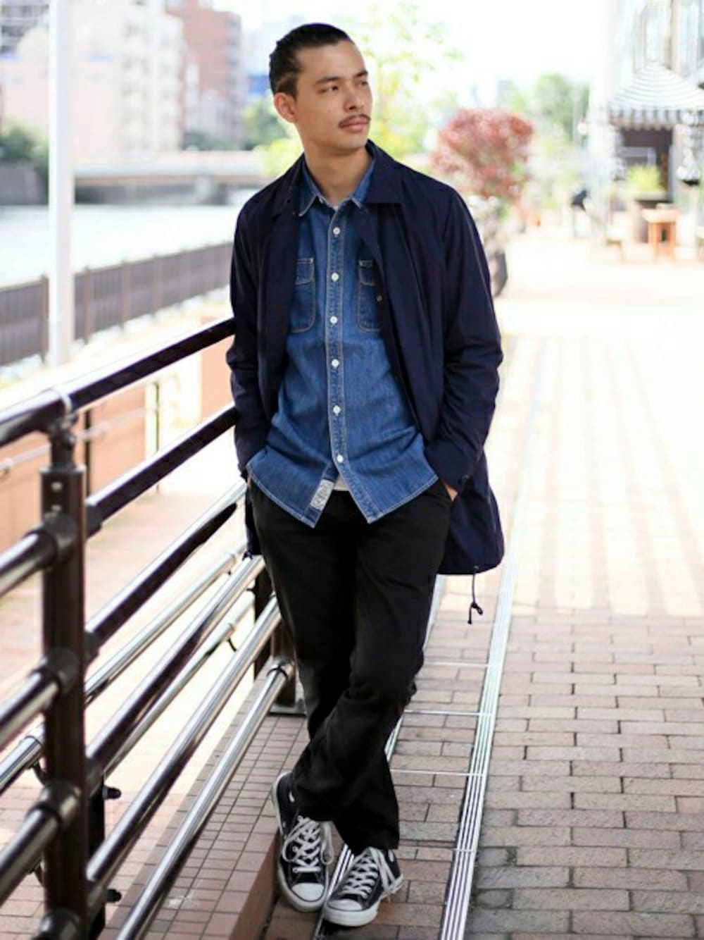 グランテックスモッズコート・ネイビー/MEDIUM デニムワークシャツ・インディゴブルー/MEDIUM TRスラックス・ブラック/MEDIUM H173 W73 58kg