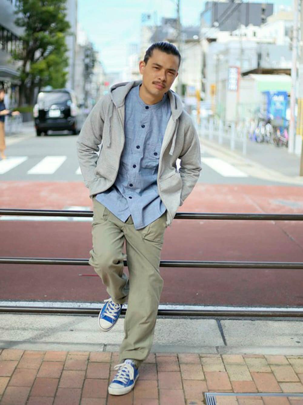 ヘビー裏毛フルジップパーカー・グレー/MEDIUM シャンブレーワークシャツ・ブルー/MEDIUM ミリタリーバックサテンパンツ・カーキ/MEDIUM H173 W73 58kg