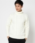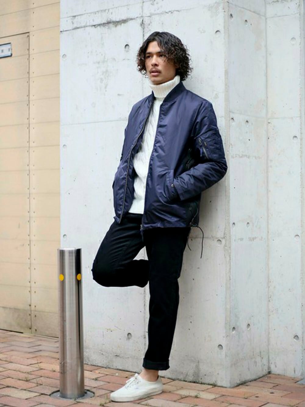 SIDE LACE デザインMA-1ジャケット・ネイビー/MEDIUM ケーブル編みタートルネックニット・ホワイト/MEDIUM コーデュロイテーパードパンツ・ブラック/MEDIUM H173 W73 58kg