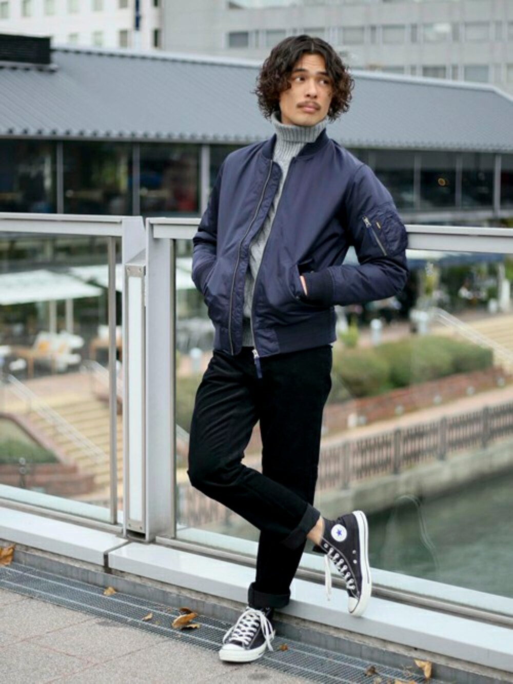 STANDARD MA-1・ブルー系/MEDIUM ケーブル編みタートルネックニット・グレー系/MEDIUM(11/7トピックス掲載商品) コーデュロイテーパードパンツ・ブラック系/MEDIUM H173 W73 58kg