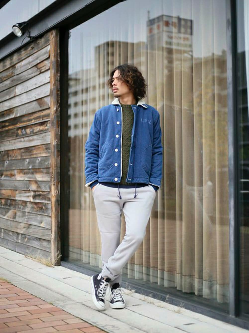 カットデニムボアN-1ジャケット・ネイビー/MEDIUM フィッシャーマンクルーニット・カーキ/MEDIUM サーマルフリースパンツ・グレー/MEDIUM H173 W73 58kg