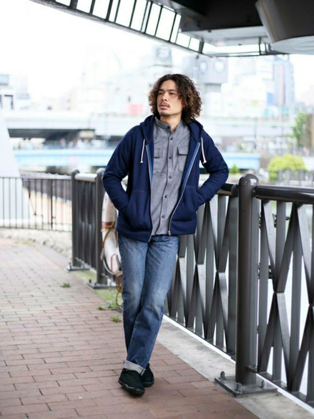 サーマルフリースジップパーカー・ネイビー/MEDIUM CPOバンドカラーネルシャツ・グレー/MEDIUM FirstDenime【Tapered Narrow Fit A-NewUsedMod-/テーパードナロウフィットA NewUsedWash】・ダークインディゴブルー/29 H173 W73 58kg
