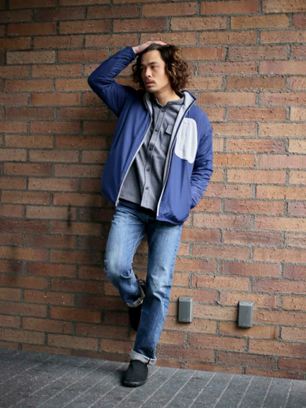 フリースリバーシブルジャケット・グレー系/MEDIUM FirstDenime【Tapered Narrow Fit A-NewUsedMod-/テーパードナロウフィットA NewUsedWash】・ブルー系/29 CPOバンドカラーネルシャツ・グレー/MEDIUM H173cm