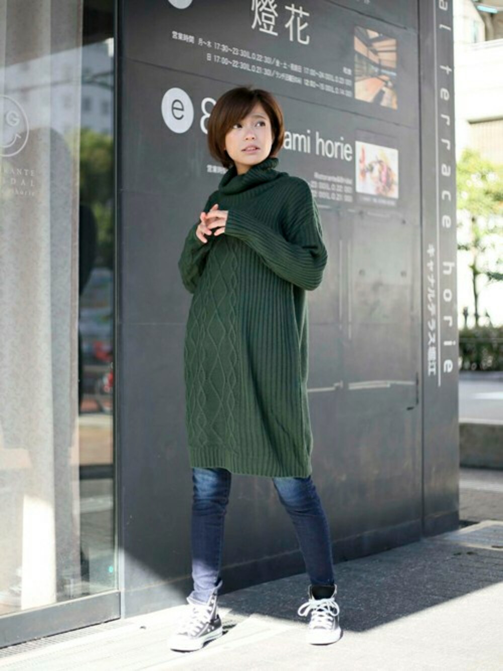 ケーブル柄ニットワンピース・ダークグリーン/FREE 【Made In Japan】ハイウェストスキニーデニム・ダークインディゴブルー/X-SMALL H160cm