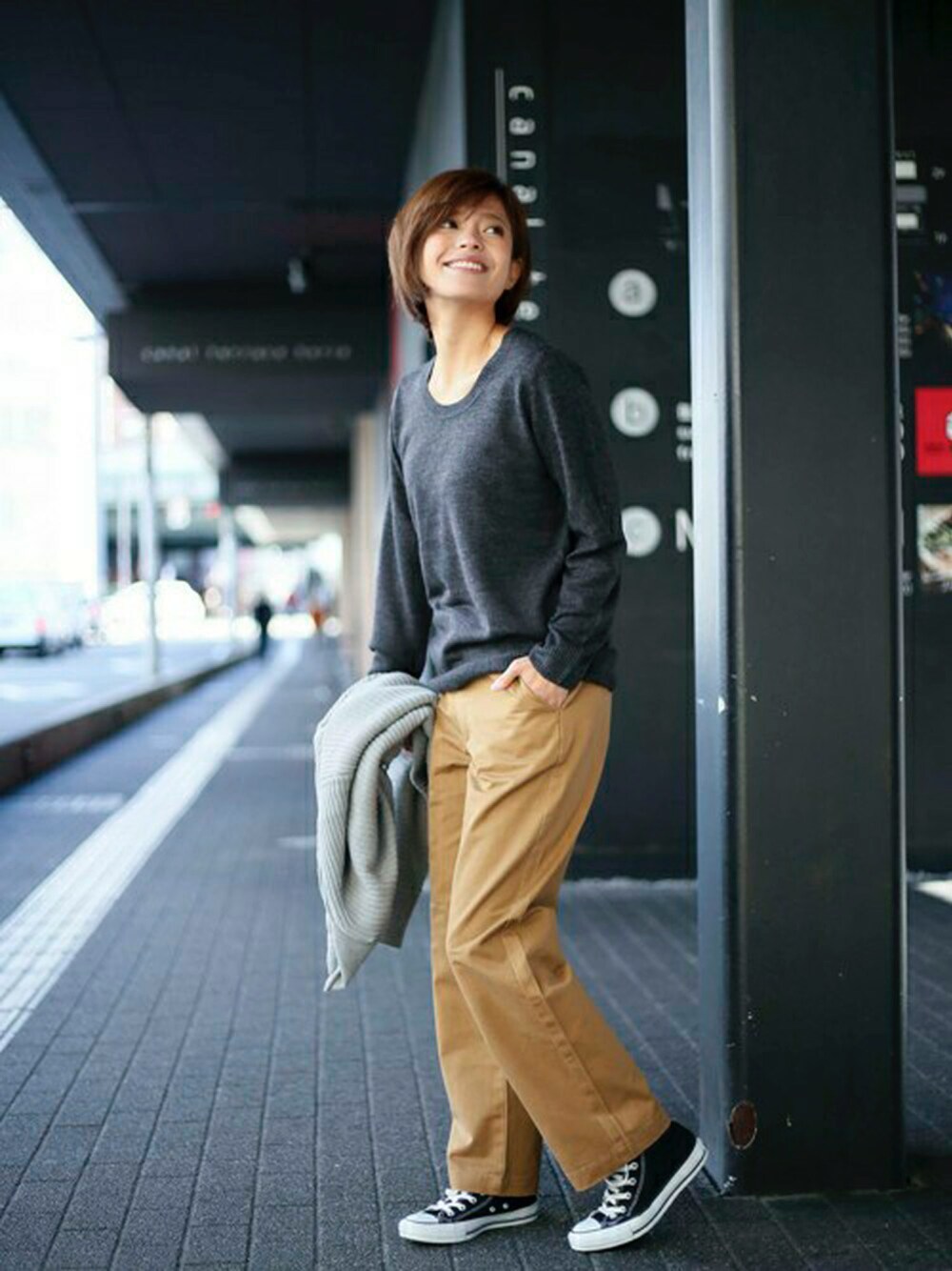 ガーター編みコーディガン・杢グレー/FREE ソフトタッチクルーネックニット・ブラック/FREE チノワイドパンツ・キャメル/FREE H160cm