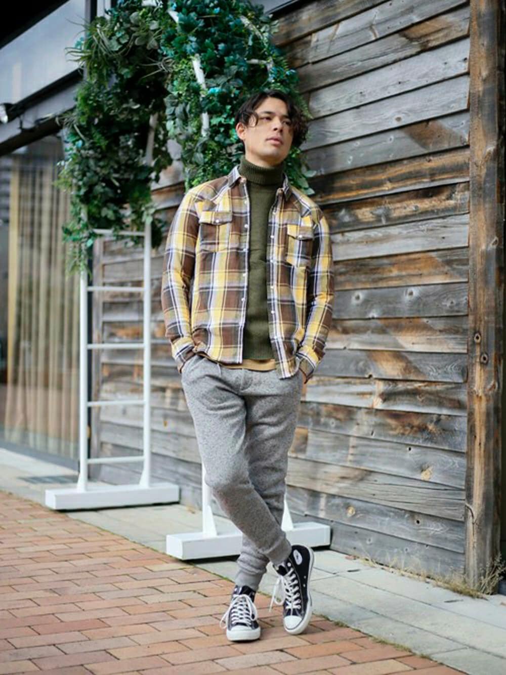 ヘビーフランネルウェスタンシャツ・イエロー系その他3/MEDIUM ラム天竺タートルネックニット・カーキ/MEDIUM ニットフリーススウェットパンツ・グレー/MEDIUM H173