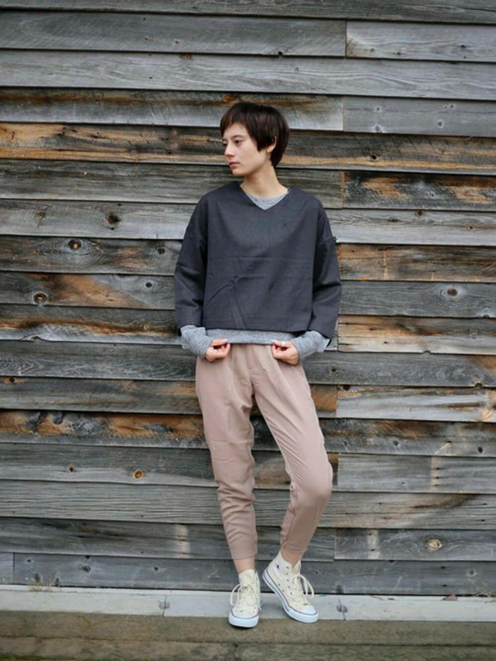 無地フランネルVネックトップス・ブラック/FREE ニットソーリブトップス・グレー/FREE 2タックジョガーパンツ・ベージュ系その他/FREE H:168cm