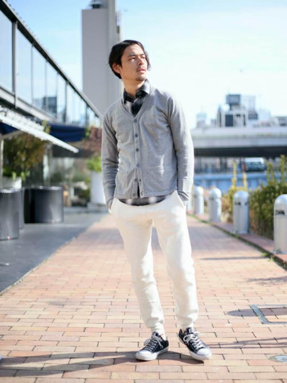 カシミアミックスカーディガン・グレー/MEDIUM オンブレチェックシャツ・ブラック系その他/MEDIUM 【Champion/チャンピオン】スウェットパンツ・オートミール/MEDIUM H:173㎝
