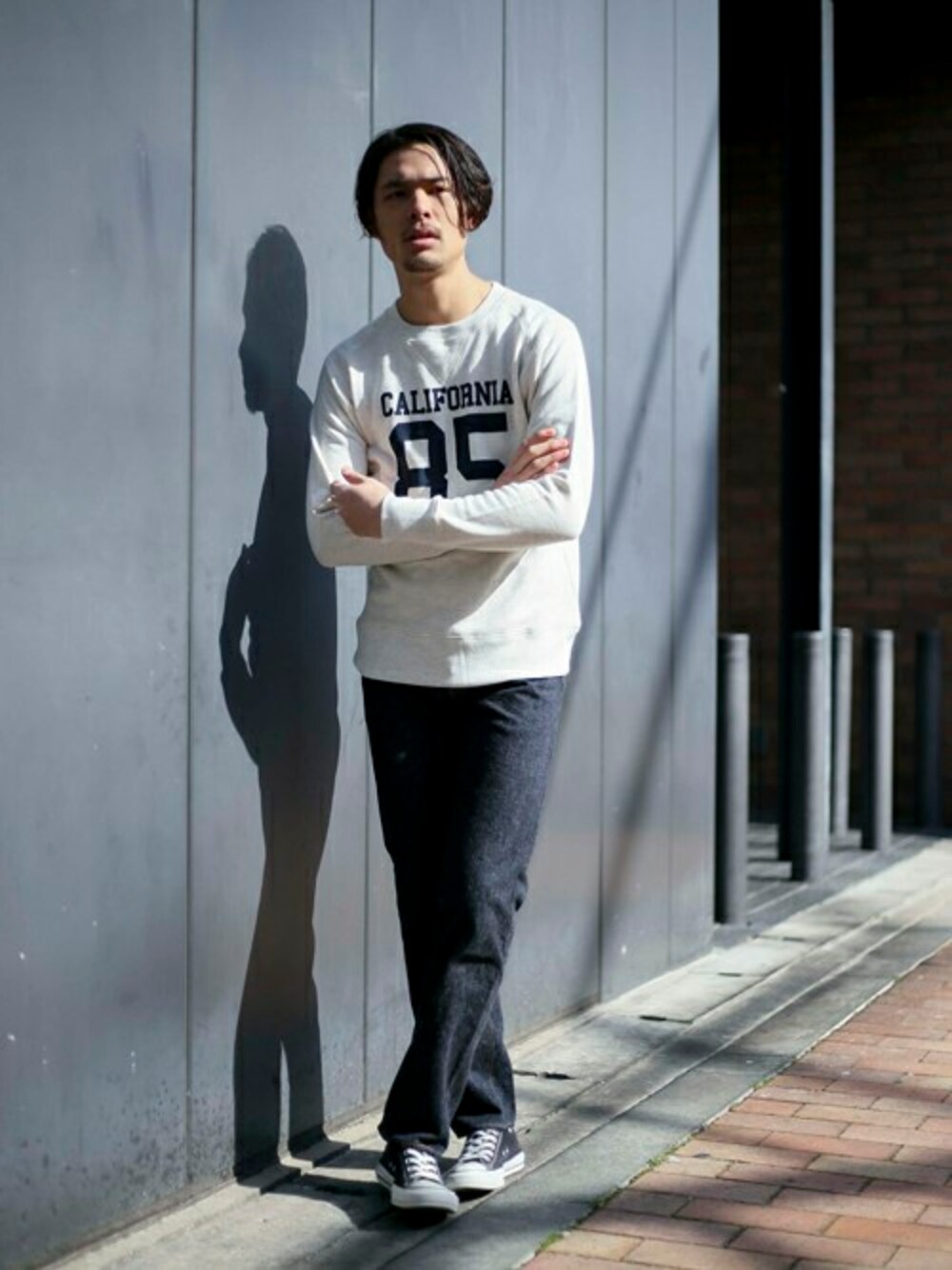 DenimeWebStoreのスウェット「プリントクルーネックスウェット CARIFORNIA」を使ったコーディネート