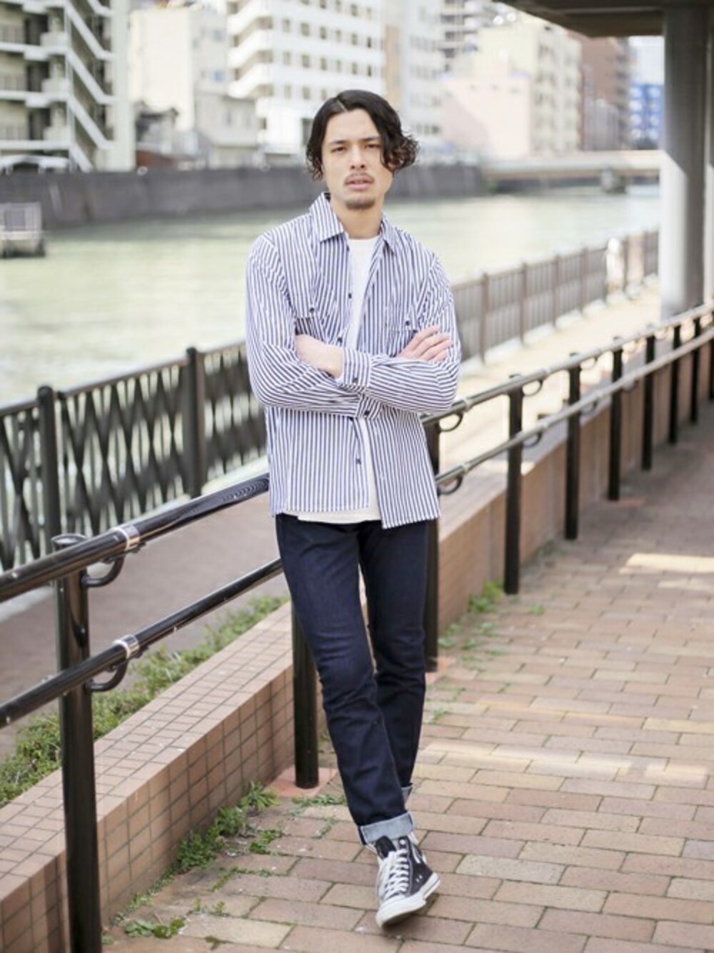 ストライプワークシャツ・ブラック系その他4/MEDIUM ビッグワッフルロングスリーブTEE・ホワイト/MEDIUM 【Made in Japan】NEW Pencil Fit type/タイトシルエットストレッチデニム・インディゴブルー/30 H;173㎝