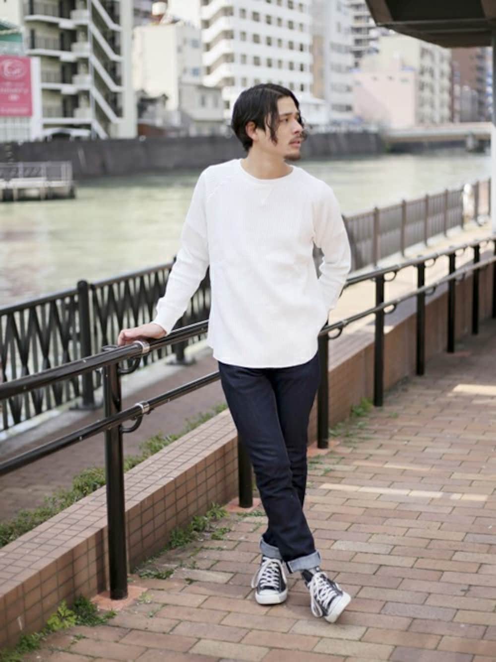 ビッグワッフルロングスリーブTEE・ホワイト/MEDIUM 【Made in Japan】NEW Pencil Fit type/タイトシルエットストレッチデニム・インディゴブルー/30 H;173㎝