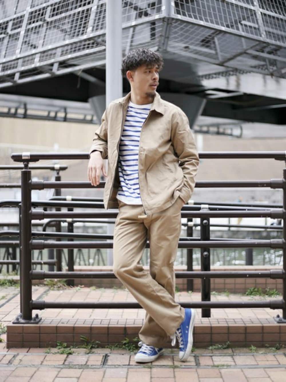 ツイルスウィングトップ・ベージュ/MEDIUM ボーダーリブロンTEE・ブルー/MEDIUM ツイルチノパンツ・ベージュ/MEDIUM H:173㎝