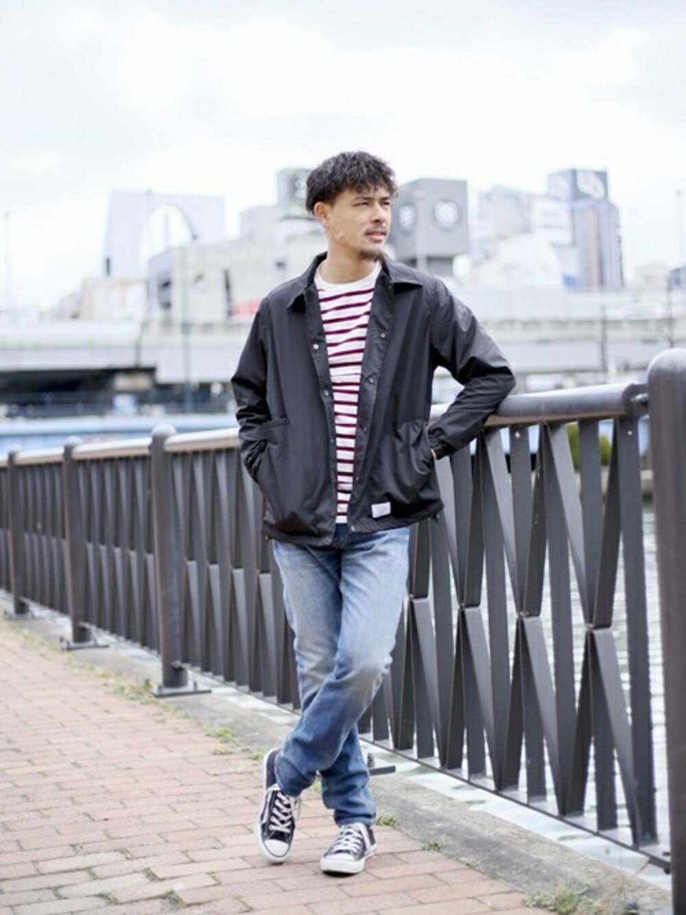 コンビニエンスコーチジャケット・ブラック/MEDIUM ボーダーリブロンTEE・レッド/MEDIUM 【MadeInJapan】NEW PENCIL FIT TYPE USED WASH MODEL・インディゴブルー/32 H:173㎝
