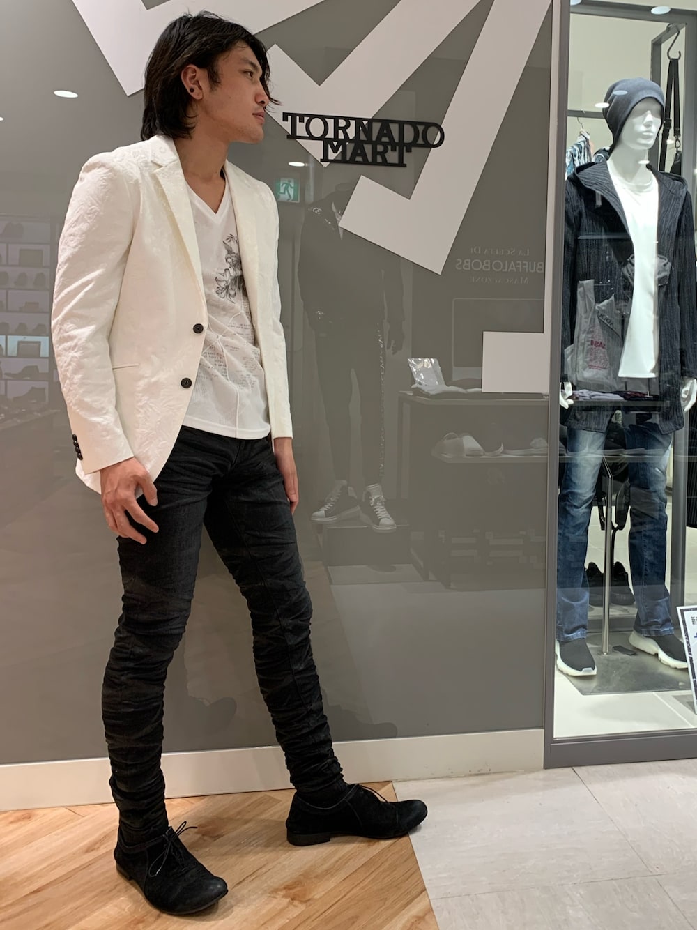 こんにちは!トルネードマート新宿マルイメン店の粕谷です! 今回ご紹介するアイテムはボタニカルジャカードジャケットです! こちらのアイテムはボタニカル柄の同じデザインのパンツもあるためセットアップとして合わせるのもおすすめです! 今回はカジュアルに着こなすことを意識して黒のスキニーパンツとあわせてみました! 白のジャケットを映えさせるためにあえて黒にしましたが明るめのブルージーンズでも非常に合います! カッコイイ新作が続々と入荷してきております!! 是非店頭でお試しして頂きたいです! いるい ジャケット 6311171004 ¥29000+税 インナー 6311178007 ¥10,800+税 パンツ 6311117003 ¥26,800+税 シューズ 6310166004 ¥29,000+税