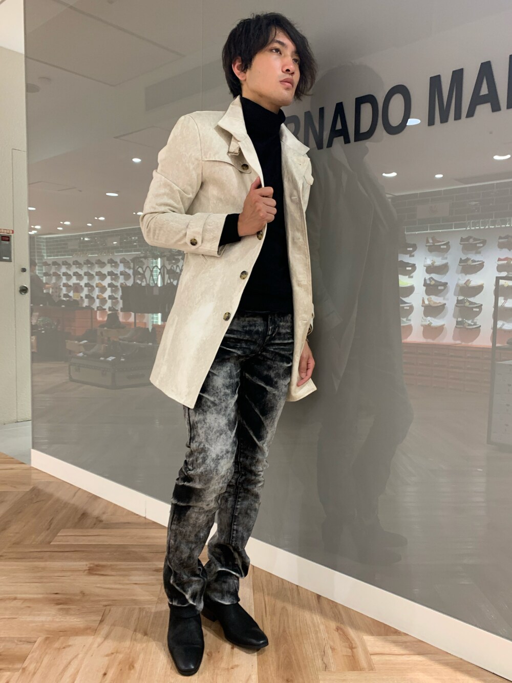 こんにちは!トルネードマート新宿マルイメン店の粕谷です! ここ数日気温が高い日が続きましたが、来週になると気温が先週などと比べると結構下がるみたいですね。 ボクは毎朝起きるとその日の気温などを確認して何を着て出掛けようか自宅の屋上によく行くのですが、今朝は寒くて一旦上着を取りに戻りました^^; そんなことで今回は新作のコートをご紹介させていただきたいと思います! トルネードマート定番のマイクロスエードを使用したコートで去年は返し襟の形でしたが、今年のコートはスタンド襟にベルトが付いていて顔周りがスッキリと見えるデザインとなっております! 今回のスタイリングは今朝寒かったということもあり、白コートが主役の魅せるコートスタイリングというテーマで組ませていただきました!! 白のコートというと派手だと敬遠される方もいらっしゃると思いますが、今回は自然と着こなして頂けるようにモノトーンのアイテムを組み合わせパンツは黒単色などにはせず程よく白の加工もあるパンツで遊びも入れたスタイリングを組ませていただきました!! 来週から寒くなってくると思いますので防寒対策にいかがでしょうか? 皆様の御来店心よりお待ちしております! コート 6311213003 ¥34,000+税 ニット 6311275402 ¥10,800+税 パンツ 6311217009 ¥27,800+税 シューズ 6311266401 ¥