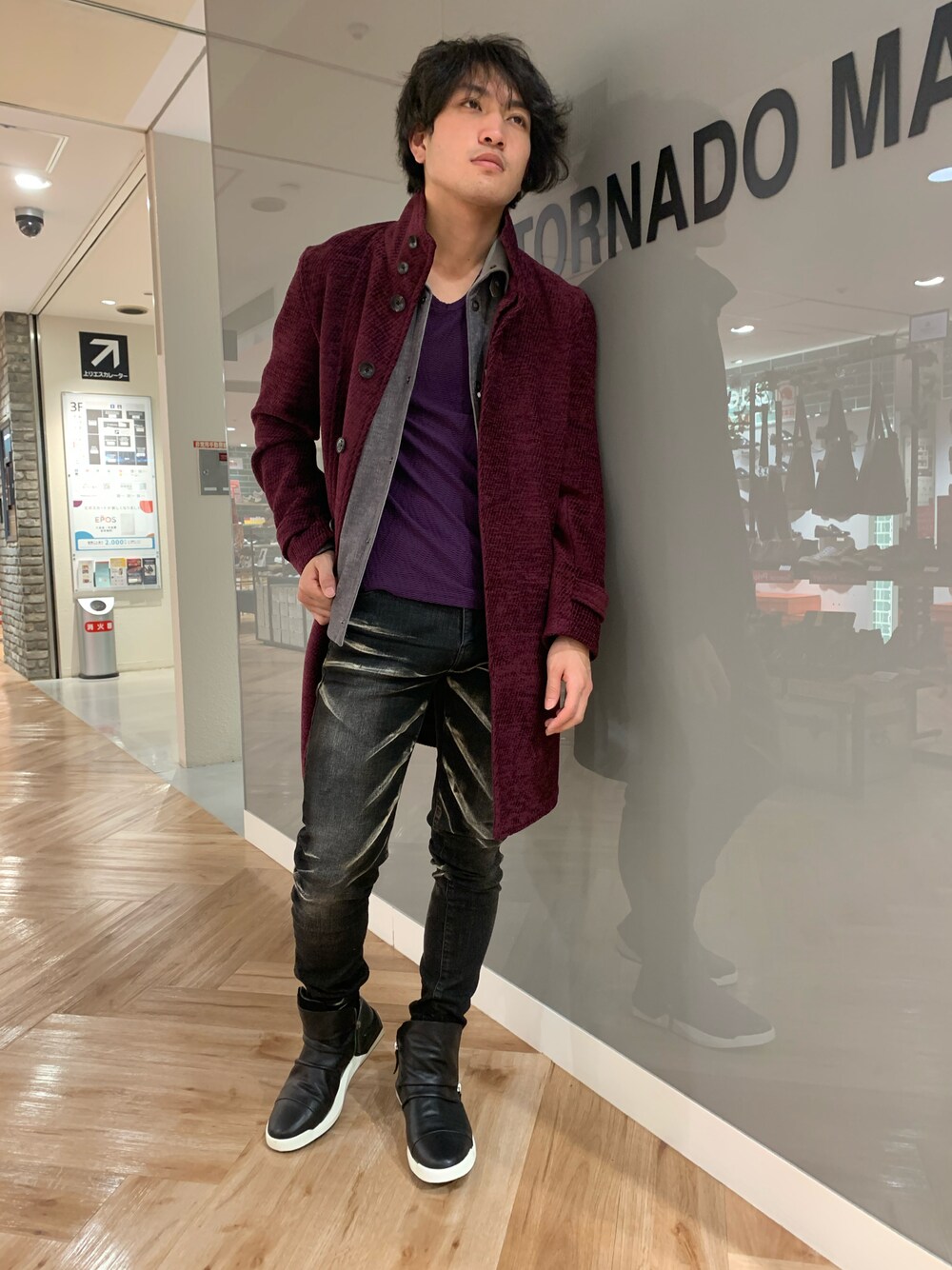こんにちは!トルネードマート新宿マルイメン店の粕谷です! 冬は重ね着がおおくなりますよね? そんな重ね着をオシャレに魅せるスタイリングを今回は組ませていただきました! パープル系を基調としたスタイリングです!! コートにはダークパープルのカルゼのコートを使い秋時期ですとこちらにインナーでいいんですが、今回はこちらに中間着として裏起毛のカーディガンを使うことにより、冬時期も行けちゃうスタイリングとなっております! しかも、こちら今回のスタイリングで使っているアイテム全部SALE対象のためお安くお買い求めいただけるアイテムとなっております!! 店頭に実際に来ていただいてお試しいただきたいです!! コート 6310213401 ¥41,000+税 カーディガン 6310277402 ¥16,800+税 インナー 6311277005 ¥12,800+税 パンツ 6310217007 ¥25,800+税 シューズ 6318266199 ¥37,000+税