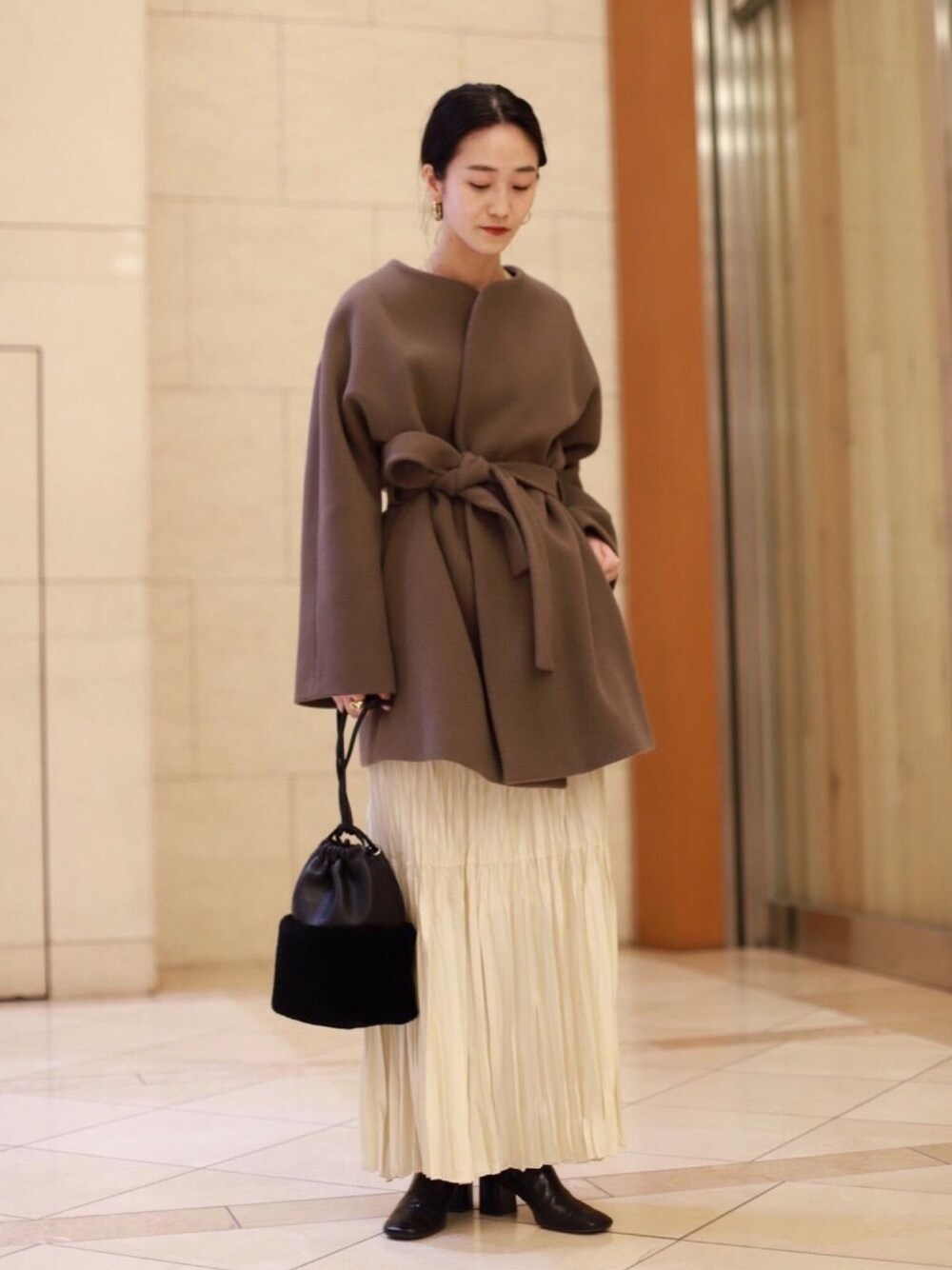ミドル丈のアウターにロングスカートを合わせ、スタイルアップ出来るようにウエストのベルトをしっかりと締めて着用しました。アウターは少しゆったりした造りなので、とろみのあるボトムスとの相性が良いです。