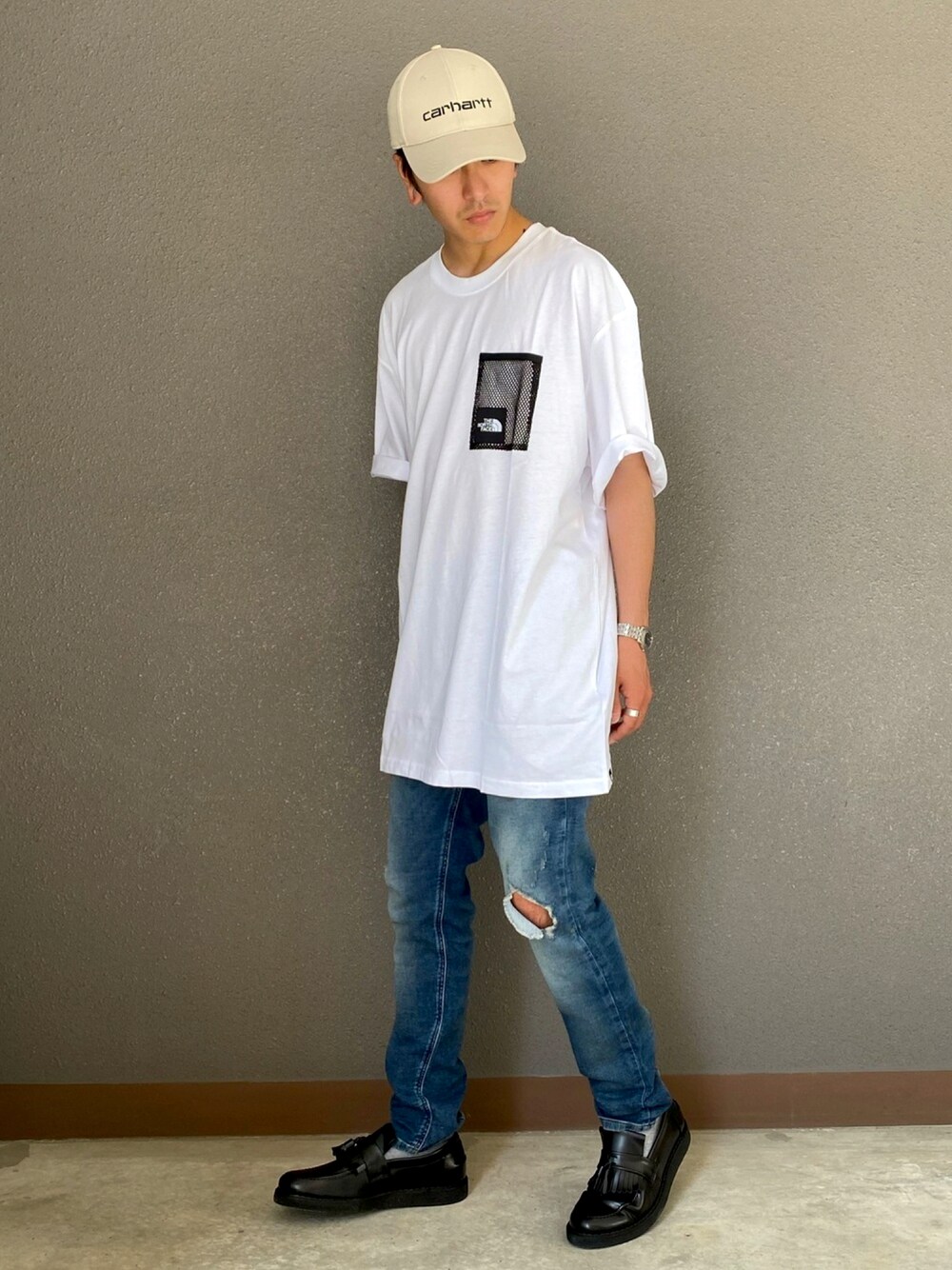 Masao.のキャップ「【Carhartt】CANVAS SCRIPT CAP / 【カーハート】キャンバス スクリプト キャップ オーバーライド」を使ったコーディネート