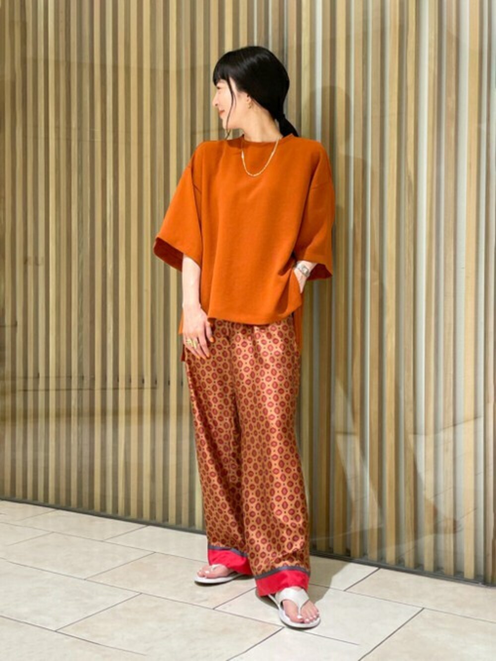 〈Edition〉PE Georgette オーバーTシャツブラウス 素材感 : 夏場の暑い時期にも体から離れたシルエットで風を孕み涼しく着ていただけます。 サイズ感 : オーバーサイズのTシャツ型のブラウスですが、生地の落ち感からすっきりとした印象になります。 ポイント : ブラウン系のワントーンでまとめました。 柄のパンツを合わせシンプルすぎず、リラックス感のあるスタイリングにしました。