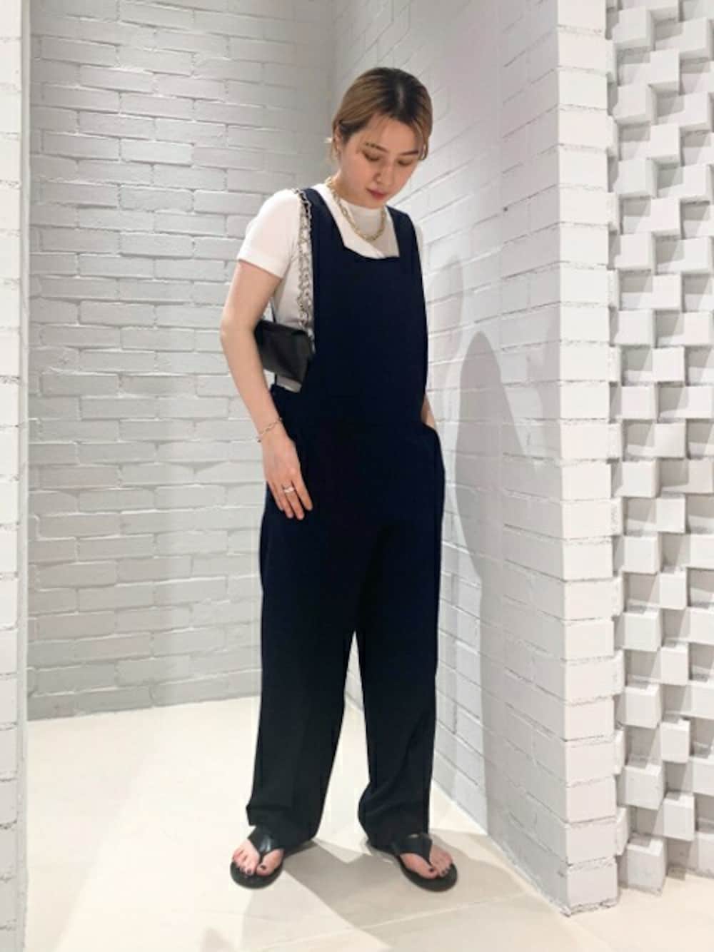 〈BACCA〉シアサッカー カバードサロペット 素材感: ストレッチが効いているシワになりにくい素材です。 サイズ感: ワンサイズ。ほどよくゆとりがあります。 インナーは〈Edition〉のコンパクトなTシャツを合わせました。