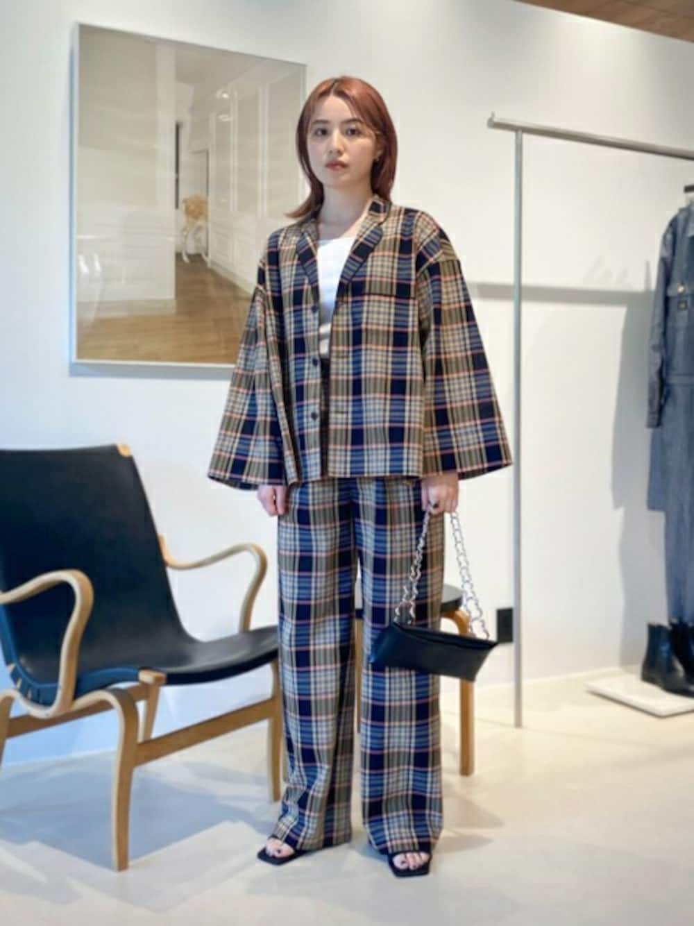 〈Edition〉マドラスパジャマシャツ 素材感: 薄手のコットン素材で涼しいです。 サイズ感: ゆったりとしたサイズ。羽織感覚でもお召しいただけます。 パジャマシャツをセットアップで着用しました。ヒールのあるサンダルとバックでラフになりすぎないようにしています。