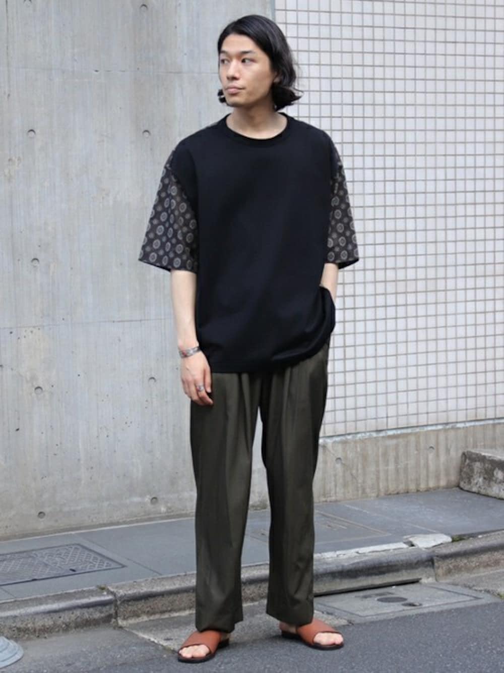 着用感の良いジャージー生地とピッチ幅の異なるストライプのシャツ生地を掛け合わせたデザインTシャツをメインに。 ソリッド×ペイズリーのデザイントップスはブラックカラーでシックな印象なので、ボトムスの素材感やサンダルを合わせて軽さを演出した夏にぴったりな大人なコーデです。