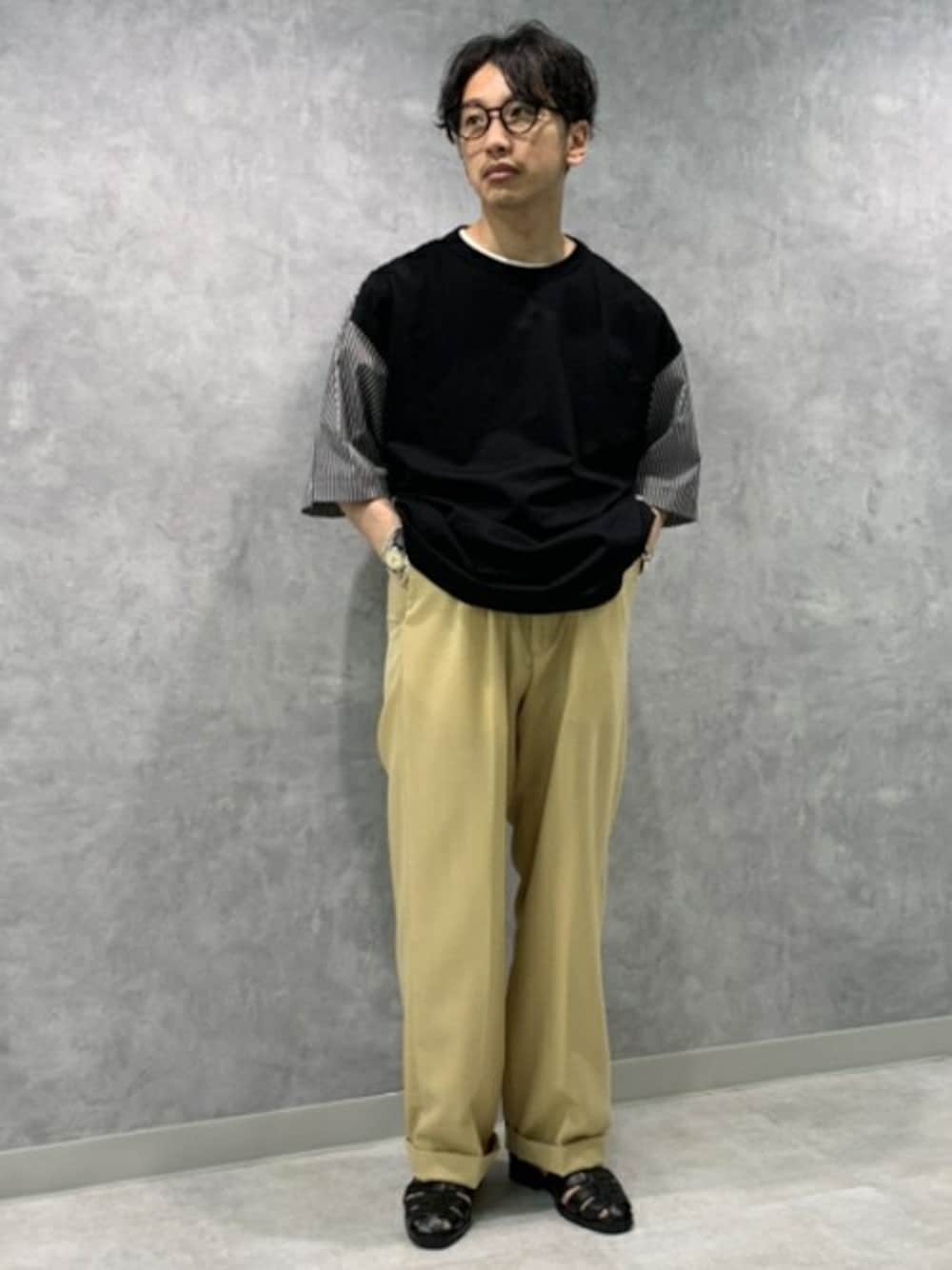 着用感の良いジャージー生地と夏らしい色合いのペイズリー柄プリントのシャツ生地を掛け合わせたデザインTシャツをメインに。 ストレートシルエットのボトムスにオーバーサイズのトップスを合わせた旬のシルエットは、重くなりすぎないシックな色味で合わせた大人な印象のコーデです。