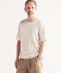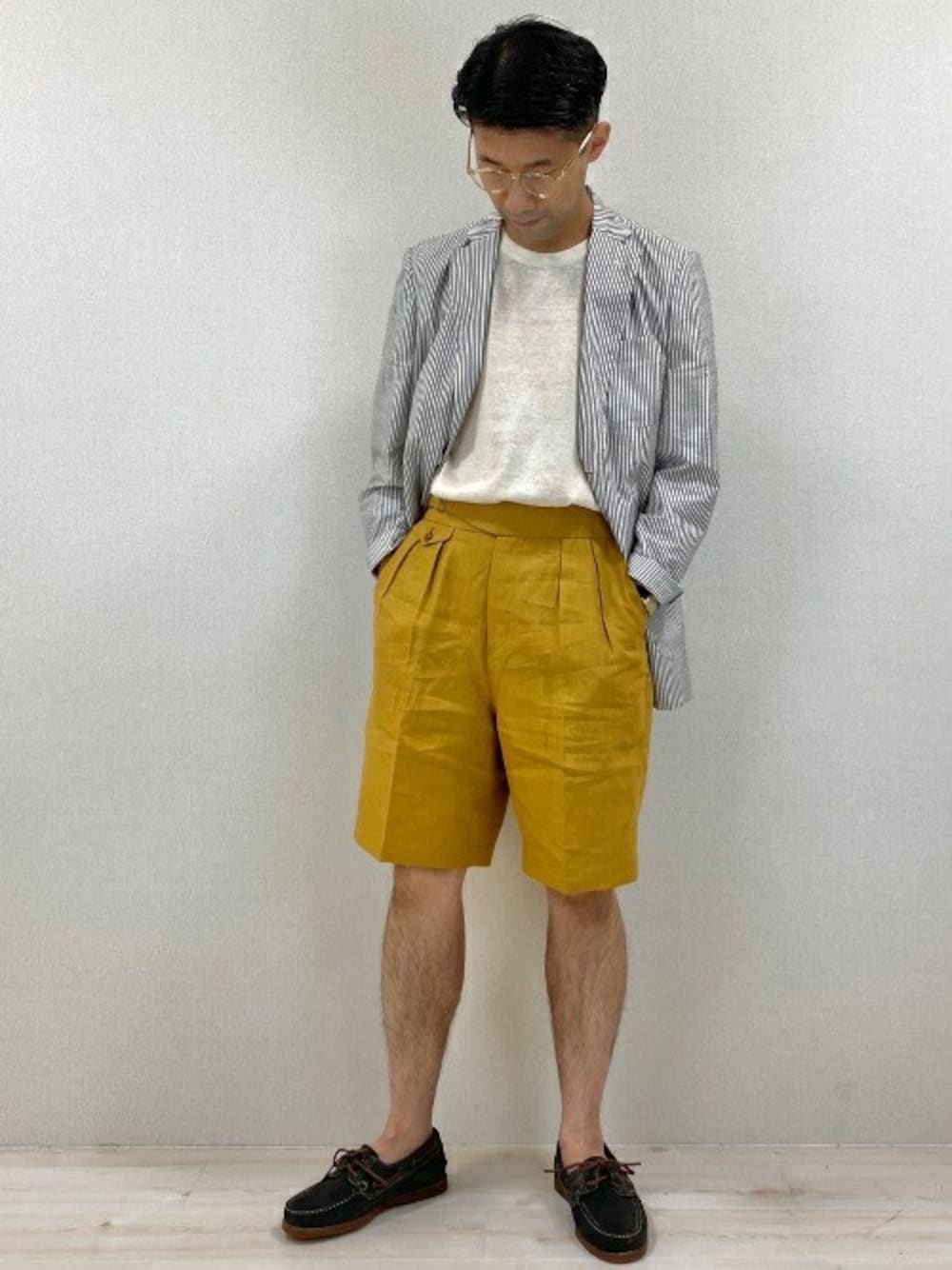 〈TOMORROWLAND〉ギザコットンシアサッカー 2Bテーラードジャケット 素材感:シャツ生地ならではの軽さと肌触りの良さが抜群。 裏地を省いた作りを活かして袖まくりをしたり、カーディガン感覚でご着用いただけます。 サイズ感:リラックスした着こなしをしたかったので、普段のワンサイズ上を選んでいます。 フィット感が欲しい方はいつも通りのサイズをおすすめします。 クルーネックニットにマスタードカラーのショーツ、足元はデッキシューズとカジュアルながら、それぞれリネン素材、ハイウエストのデザイン、グレーのスウェード革を選ぶことで“大人“仕様に。