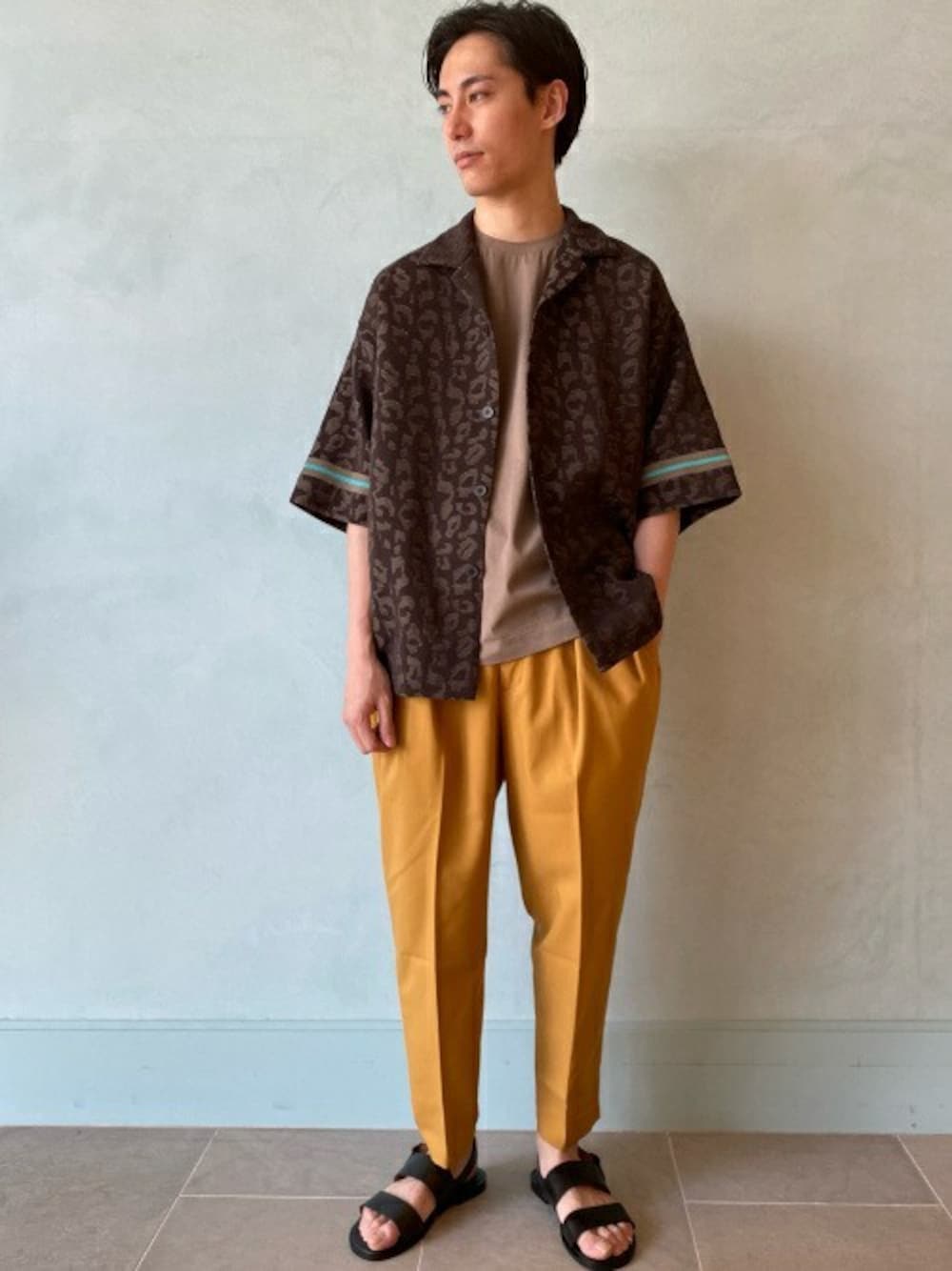 〈TOMORROWLAND〉コットンジャカードニット ショートスリーブオープンカラーシャツ 素材感:ジャガード織りのレオパード柄が印象的な膨らみのある質感。 サイズ感:全体的にゆとりの感じられるボックス型のビッグシルエット。 デザインが印象的なニット生地のシャツを主役にインナーをビッグシルエットのカットソー、色映えするパンツ、レザーサンダルを合わせて軽快にコーディネートしました。 フロントボタンを開けて、よりカジュアルな着こなしを意識しています。