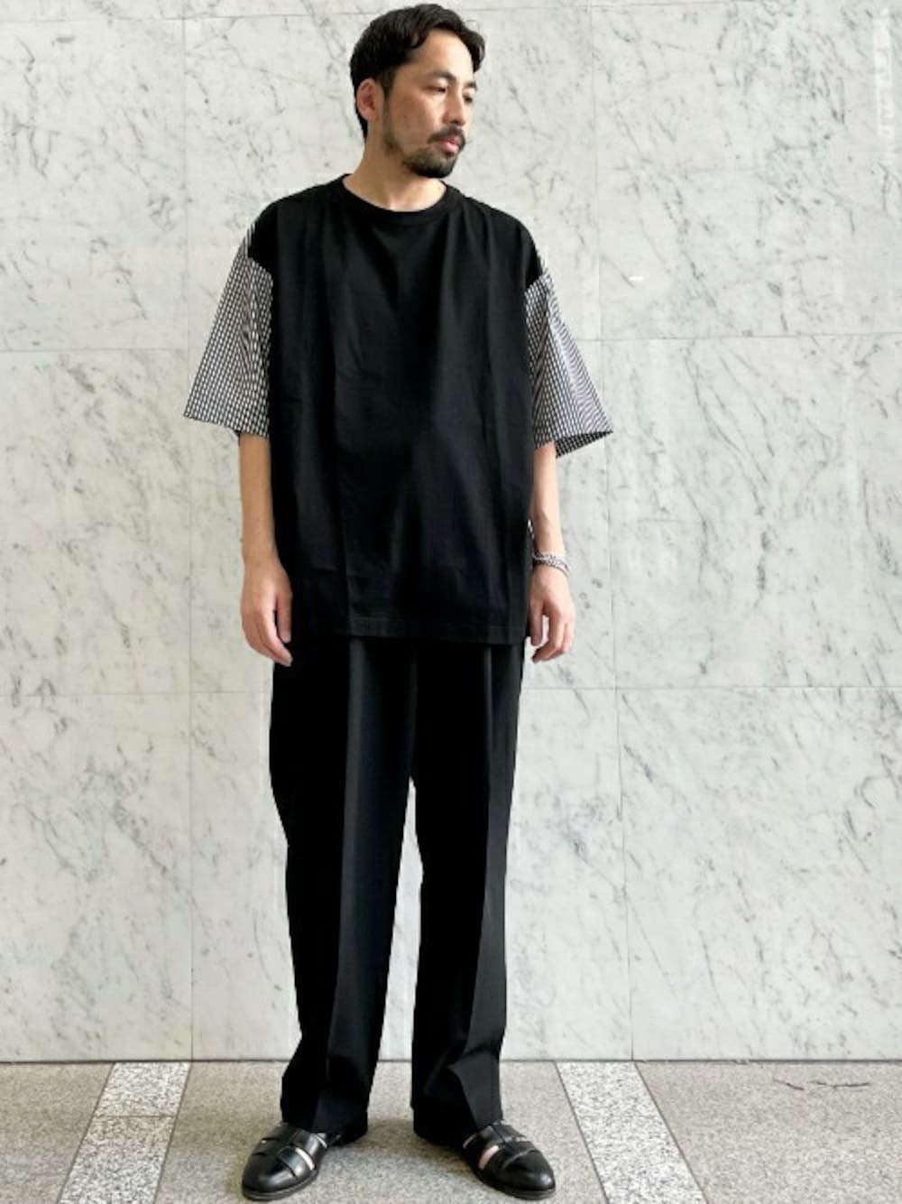 〈TOMORROWLAND〉 【WEB限定・先行予約】コットンジャージー ストライプシャツコンビ クルーネックTシャツ 素材感:前身頃は光沢感のあるジャージー素材と、後身頃はハリのあるシャツ地のコンビ。 非常に軽く、さらっとした着心地が魅力です。 サイズ感:サイズ感は大きめで、スクエアなシルエット。1枚でサマになるシルエットです。 スタイリングは、モノトーンで統一し、シャープさを演出。 夏に映えるスッキリとしたスタイリングにしました。 足元は、グルカサンダルで涼しげに。 どうしてもスタイリングが単調になりがちな、これからのシーズンに、いいアクセントになってくれるアイテムです。