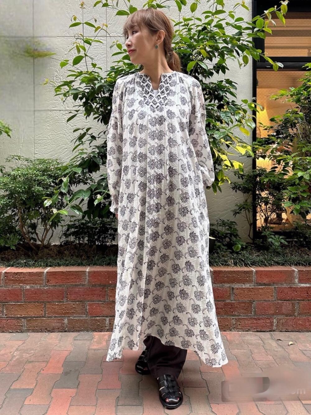 夏のシーズンにぴったりの綿素材ワンピース。 裾サイドの深めスリットによって、パンツ合わせなど重ね着ができることでおしゃれ度がアップします。 共布のウエストリボンは前後の結びを変えて違う表情を楽しむこともおすすめです。 重ねてあるパンツは綿、レーヨン素材のイージーパンツです(6300446-98 ADAWAS)