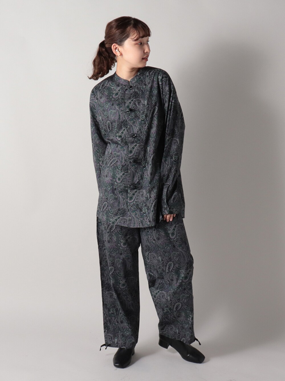 トレンドのカンフーシャツをパジャマライクにアップデートし、セットアップでの提案です! ペイズリー柄が◎ 身長 160cm サイズ M web staff