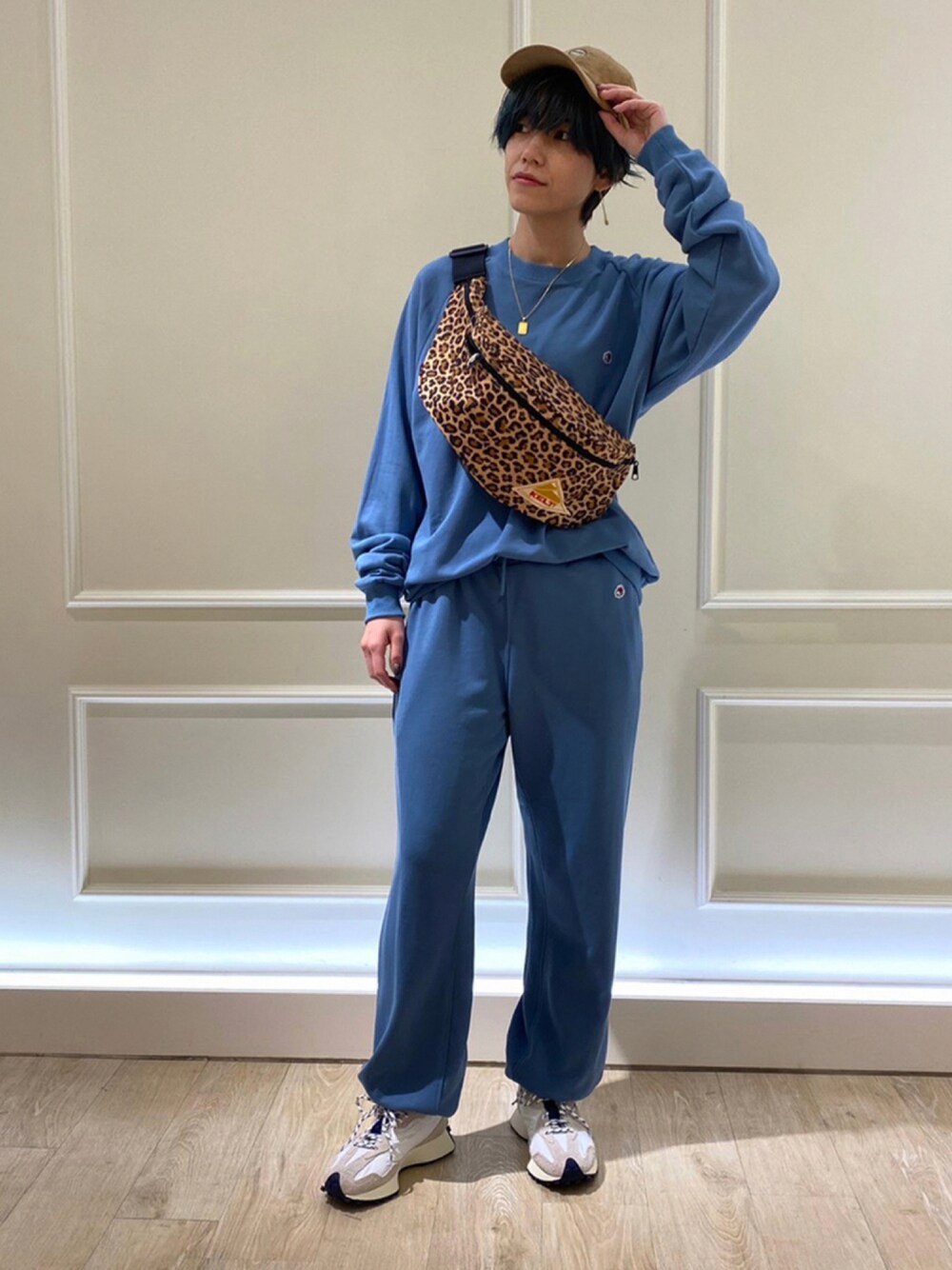 スポーティなスウェットのセットアップにバックとキャップはベージュで統一。 レオパード柄のバックがアクセント◎ 身長 164cm サイズ M 横須賀店staff
