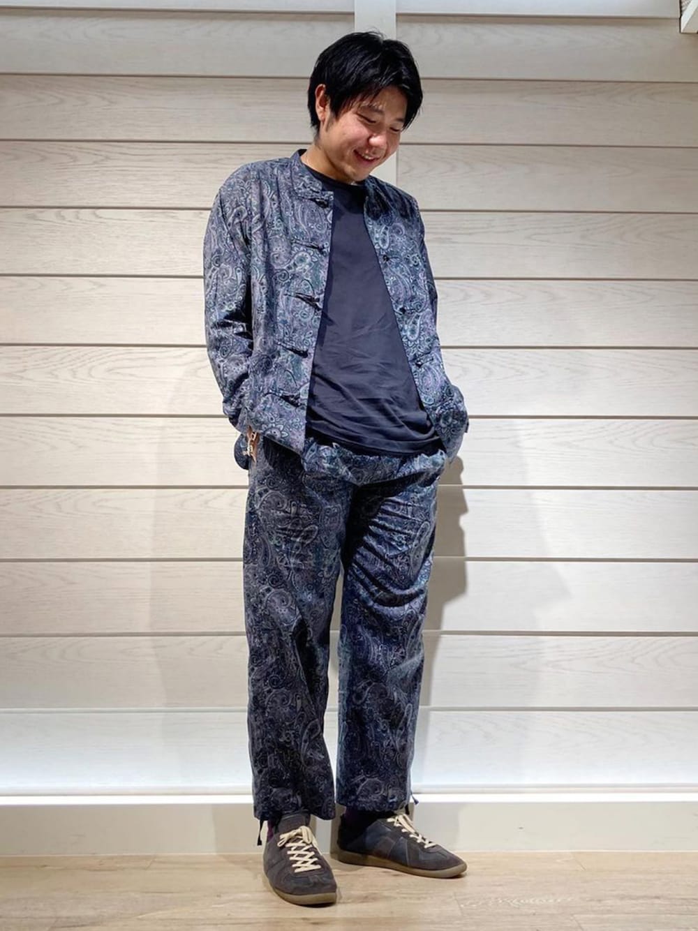 ペイズリー柄のセットアップを着こなす。 インナー、シューズはネイビーのダークトーンで合わし統一感を演出しました。 身長 179cm サイズ L 横浜店staff