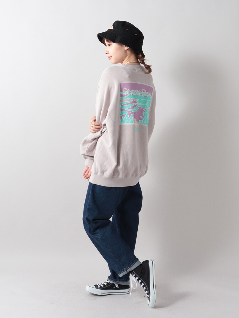 印象的なアウトドアプリントが特徴のクルーネックスウェット。 カラーによってデザインや配置も異なるので、お好みの1枚を探してみて下さい。 形はトレンドのビッグシルエットを採用。 女性が大きめに着ていただくのもおすすめです。 身長 160cm サイズ L web staff