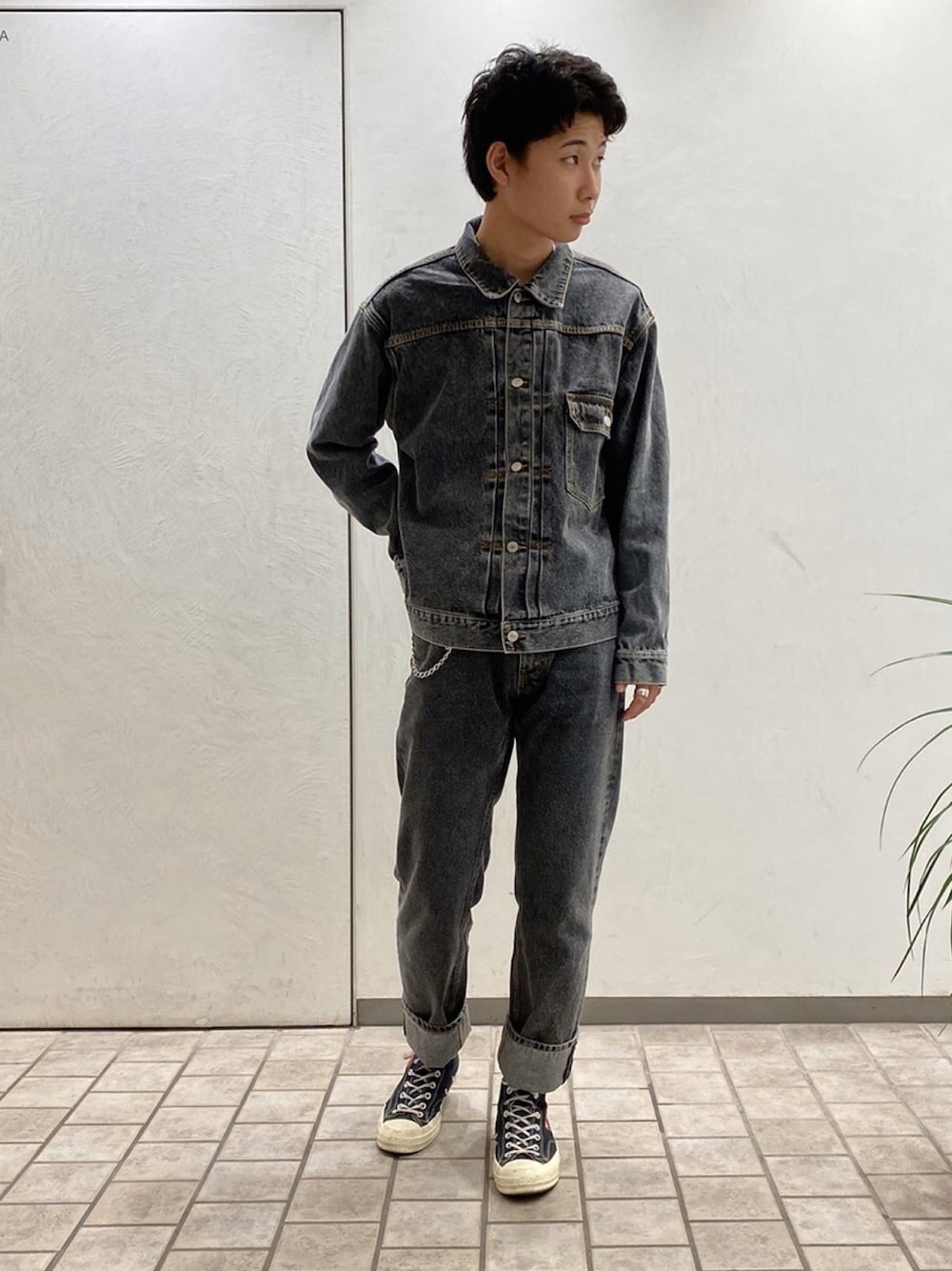 フェード感あるブラックデニムのセットアップスタイル 足元も黒で引き締めました。 身長 178cm サイズ L 二子玉川店staff