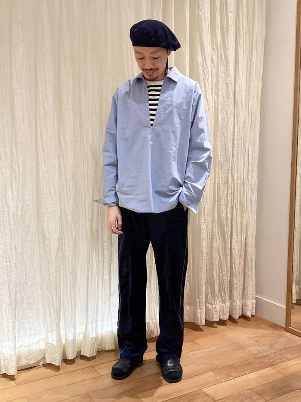 胸元が大胆に空いたスキッパーシャツ。 裾はカットオフの仕様にすることで切り口がフリンジ状になり、クラシックさと洗練された雰囲気を生かしながらもラフな感覚を楽しむことができます。 身長 176cm サイズ L 町田東急ツインズ店staff