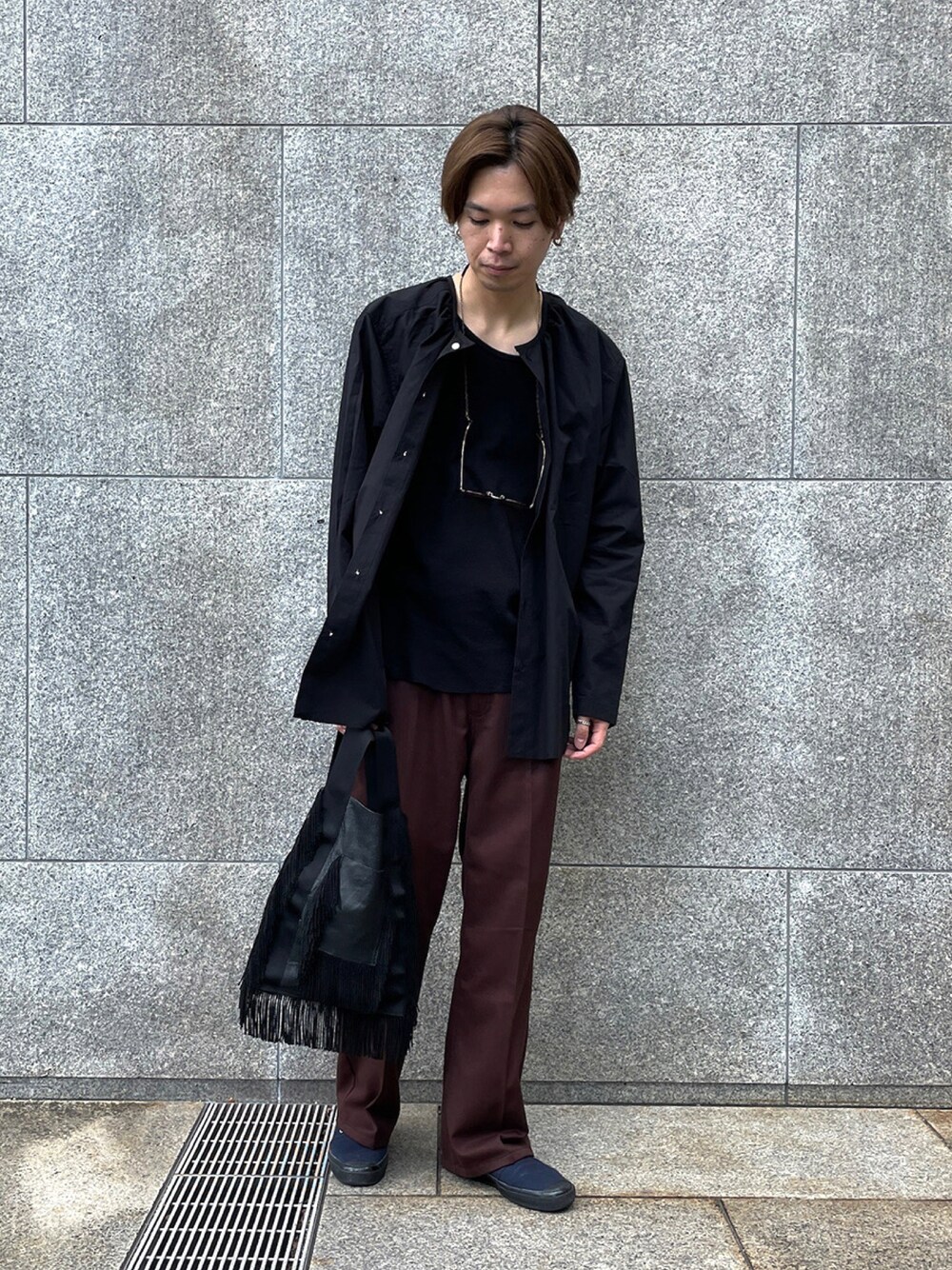 フレアパンツにフリンジバッグと70Sらしい合わせにパリッとしたオーガニックコットンのシャツを合してバランスをとりました。 身長 178cm サイズ L 天王寺店staff