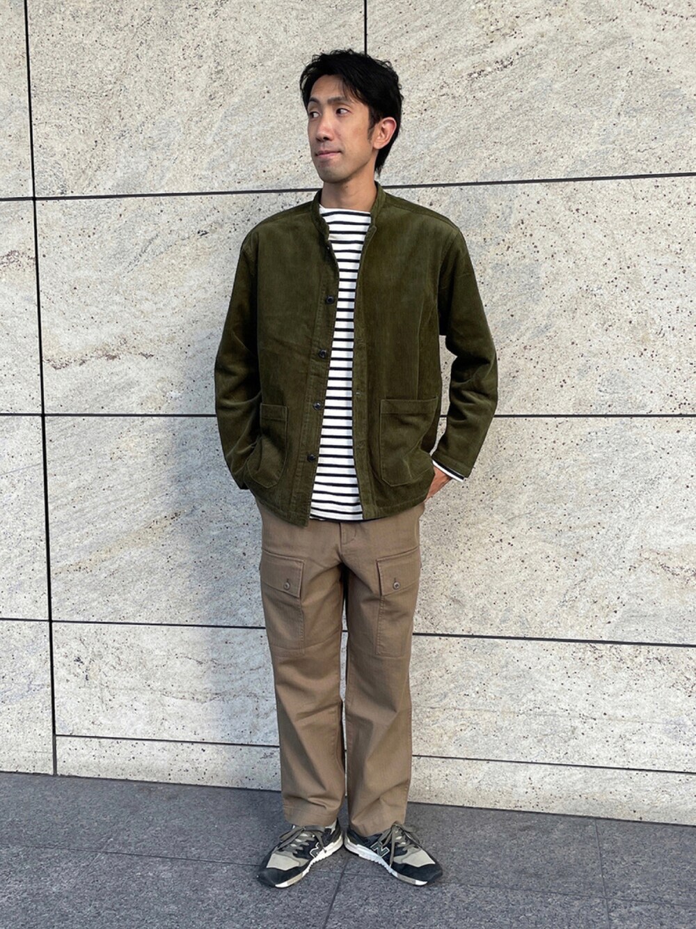 ブラウンベースのコーデですが、ボーダーで程よくカジュアルダウンしました◎ 身長 186cm サイズ L 天王寺店staff