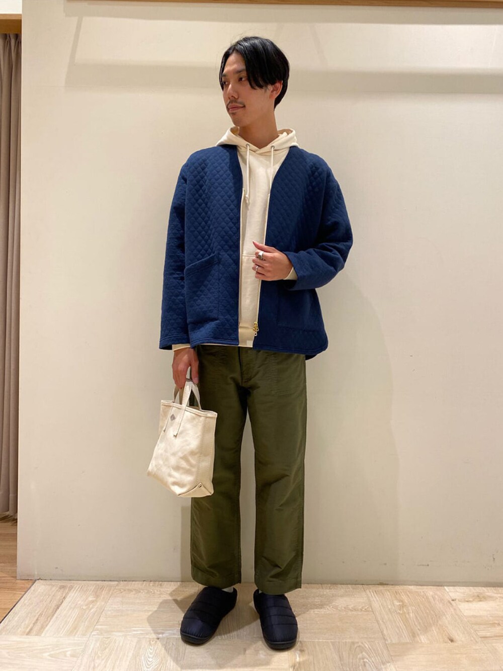 中綿キルティングのカットソー素材を採用したジップカーディガンです。 オフ色のファスナーテープとゴールドのファスナースライダーがポイントになり全体を引き締めています。 今回はカジュアルにパーカー合わせですが、 キレイ目なコートのインナーにもおすすめです。 身長 183cm ラゾーナ川崎店staff