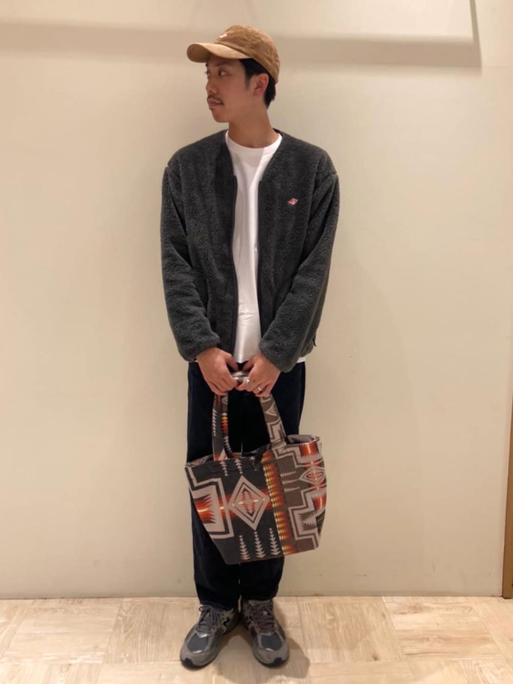 大人気DANTONのジップタイプのVネックフリースカーディガンです。 サッと羽織れる気軽さが特徴で、中に着込めるゆとりのあるサイズ感はライトアウターとしても活躍してくれます! 軽く保温性に優れたフリースは様々なシーンで活躍する事、間違いなしです。 普段XLサイズを着ることが多い私ですが、42のサイズで余裕感があるくらい、ゆとりのあるデザインになっております。 トートバッグにTAION×PENDLETONのアイテムで柄を使い、キャップはDANTONで合わせつつも素材感を変えてみました。 シンプルながらも柄と素材感にこだわったコーディネートです。 身長 183cm ラゾーナ川崎店staff