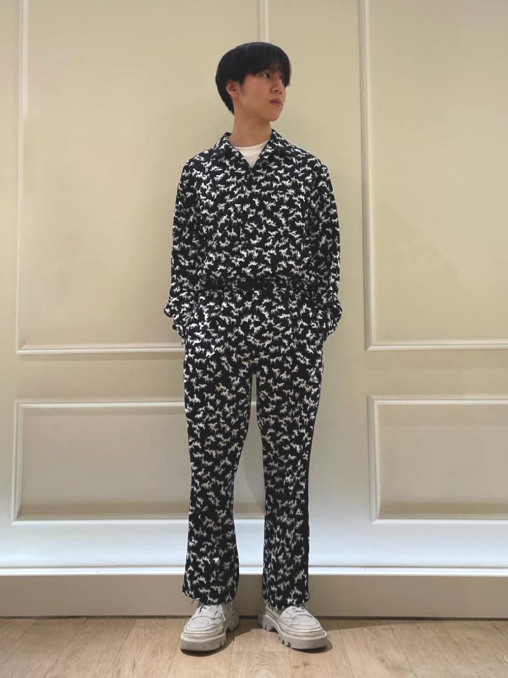 インパクト強めの一枚。 ゆったりとしたシャツはタックインしセットアップでスタイリングしました! 身長 170cm 横須賀店staff