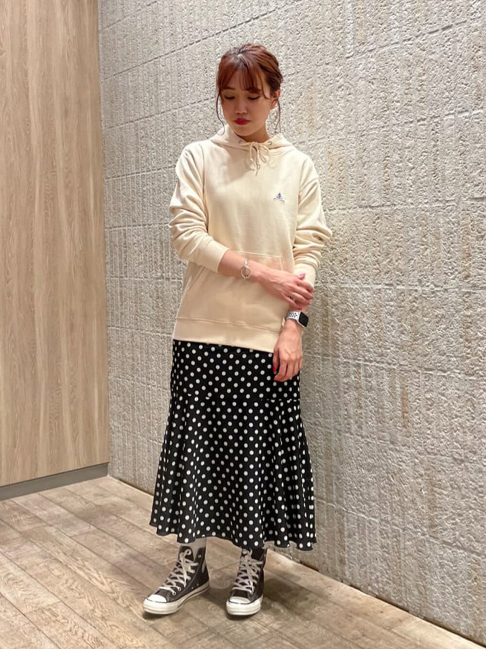 メンズのフーディはレディースが着ても可愛いです! リエミラーのスカートはシルエットがとても綺麗で2WAYで着ていただけます。 トップスはMサイズを着用しています。 スカートはワンサイズです。